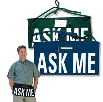These handy aprons feature "Ask Me" in large lettering that can be seen from long distances. Three large pockets also hold brochures, facility maps, guest booklets and more. Available in black or blue. $15 each. Minimum order 5.
