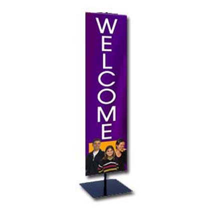 Each colorful one-sided banner is 24" x 84 " and are easily inserted into stand. The Floor Stand is adjustable from 4' to 8' tall. Floor stand will accommodate banners on both sides if desired.