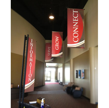 This versatile unit can also be used for ministry banners, check-in stations, etc. Call for other banner options. Banners easily slide on and off for quick change.